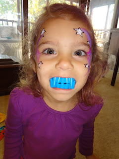 Today we met the Tompkins family in Olathe at the Dental office Halloween we went to last year. This time it was on the weekend so the dad's got to come also. The girls had fun playing games, getting cookies, face painting, getting tattos, getting hot chocolate and dancing. It was alot of fun, then we headed over to my parents for lunch...hot dogs!! Great morning.