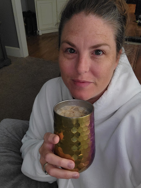 Me the next day with my Chai Tea Latte. I slept till after 9! The girls were still sleeping, I think until after 10!! I enjoyed some shows I recorded with my Chai Tea. Ahhhh so quiet!!